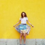 Choose a denim skirt and pair it with a basic blouse that is tucked in or a graphic tee. For an air of toughness, add on a leather or denim jacket. Add sneakers or ankle boots to finish the look.